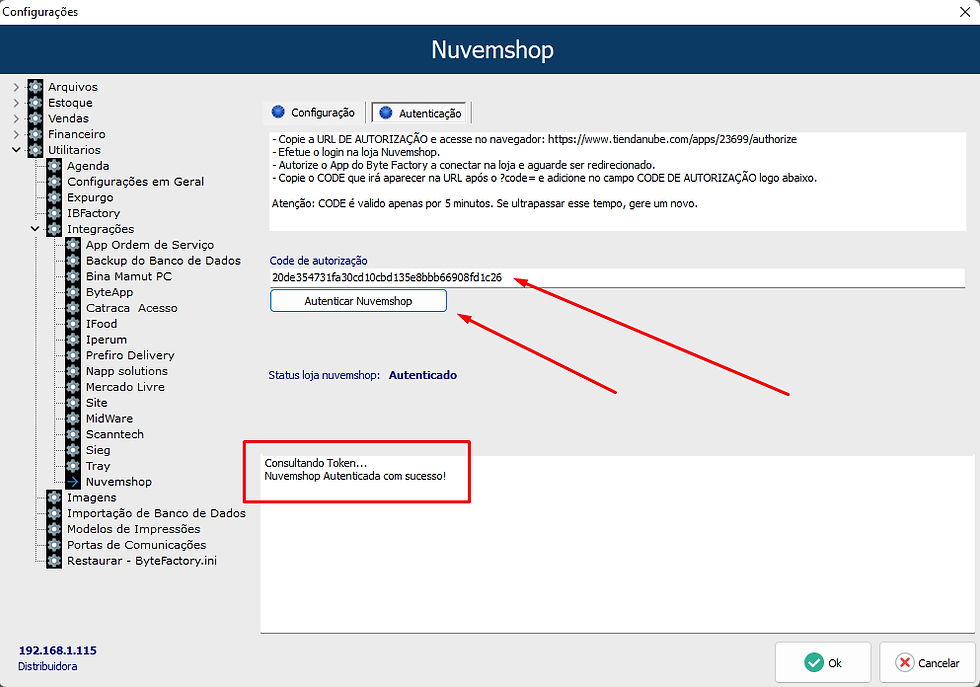 Cole o CODE de autorização e clique em Autenticar Nuvemshop